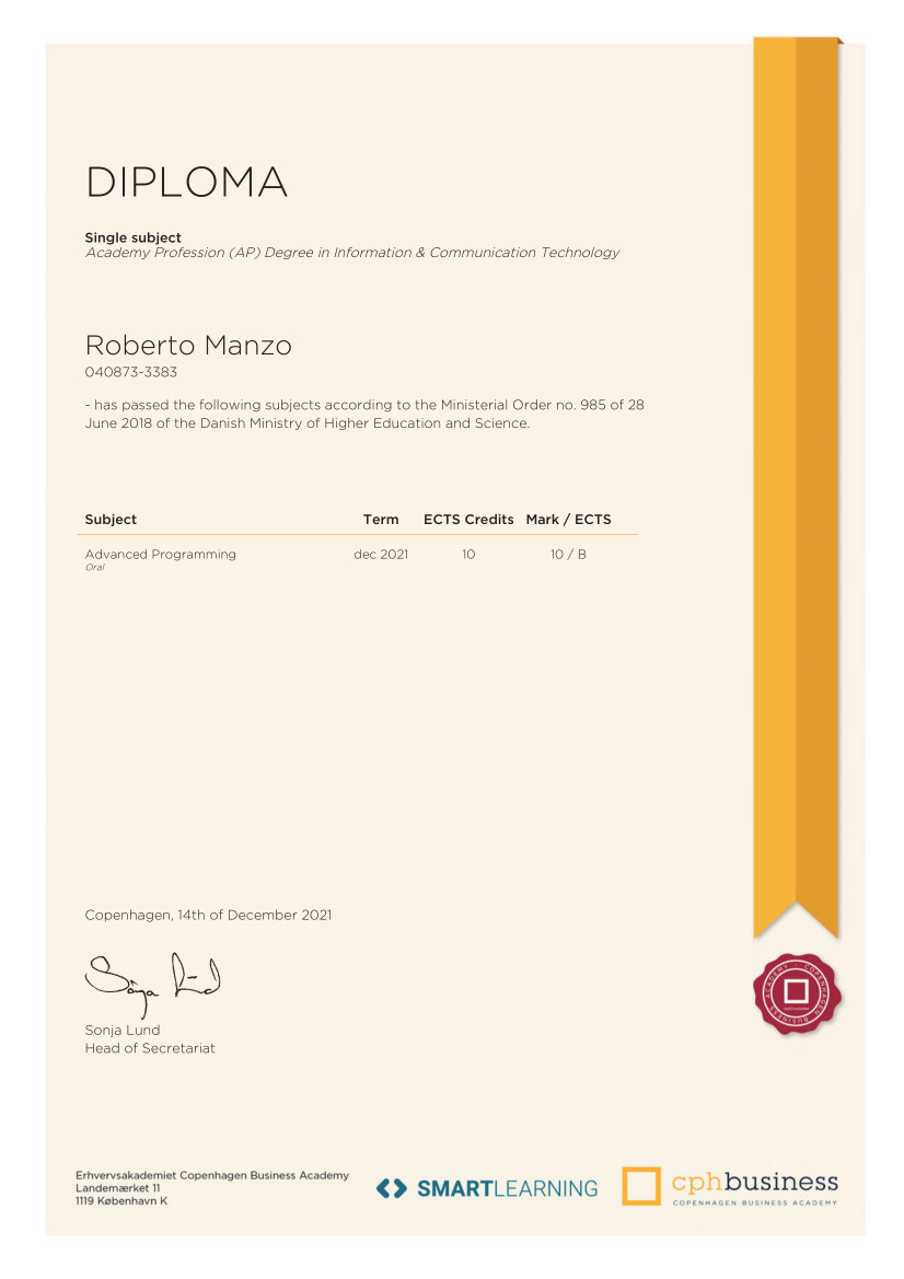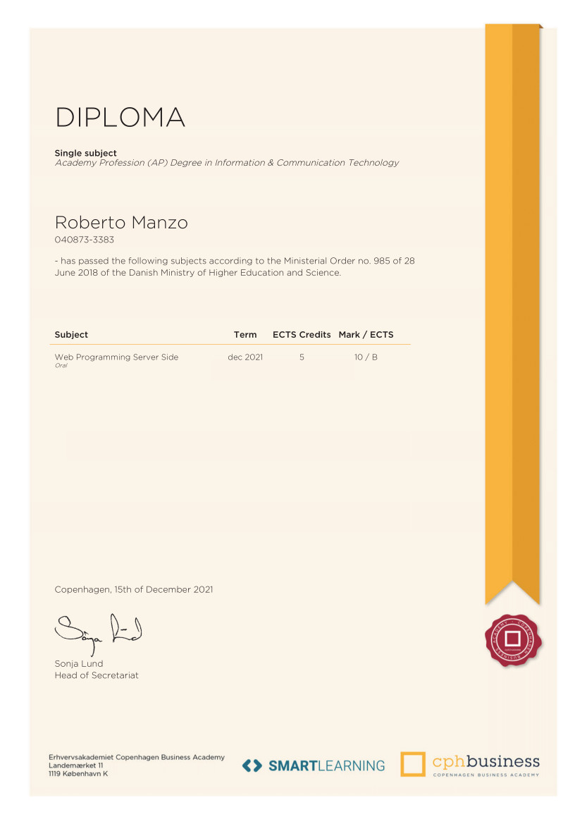 Mine diplomer vidner om mine præstationer og anerkendelser inden for IT-udvikling. Hver udmærkelse repræsenterer ikke kun mine evner, men også min dedikation til at levere resultater og overgå forventningerne.
